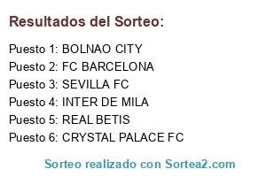Lista de participantes: FC BARCELONA, INTER DE MILA, CRYSTAL PALACE FC, REAL BETIS, SEVILLA FC, BOLNAO CITY.