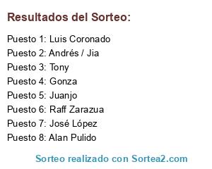Lista de participantes: José López, Luis Coronado, Tony, Juanjo, Andrés / Jia, Alan Pulido, Gonza, Raff Zarazua.
