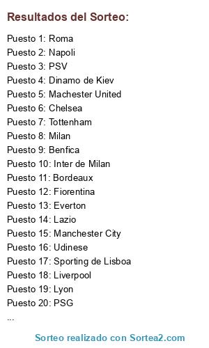 Lista de participantes: Liverpool , Porto , Marsella , Basilea, Chelsea , Valencia , Lyon , Fiorentina, Real Madrid, Lazio , Lille, Olimpiacos, Milan, Benfica, Tottenham, Atlético Madrid, Barcelona , PSG, Napoli, Everton, Machester United, Roma, Dinamo de Kiev, Sporting de Lisboa, Inter de Milan , PSV, Manchester City , Bordeaux, Sevilla , Arsenal , Bayern Múnich , Udinese.