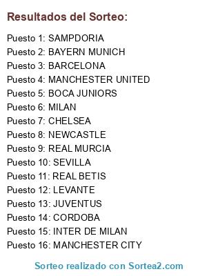 Lista de participantes: MANCHESTER CITY, LEVANTE, MANCHESTER UNITED, SEVILLA, CHELSEA, CORDOBA, BAYERN MUNICH, BOCA JUNIORS, REAL MURCIA, NEWCASTLE, MILAN, REAL BETIS, BARCELONA, JUVENTUS, INTER DE MILAN, SAMPDORIA.