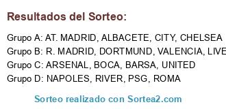 Lista de participantes: ALBACETE, ARSENAL, AT. MADRID, BARSA, BOCA, DORTMUND, CHELSEA, LIVERPOOL, CITY, UNITED, R. MADRID, RIVER, NAPOLES, PSG, ROMA, VALENCIA.