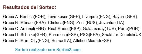 Lista de participantes: Atlético Madrid(ESP), Juventus(ITA), Real Madrid(ESP), Liverpool(ENG), Mónaco(FRA), Leverkusen(GER), Arsenal(ENG), Galatasaray(TUR), Bayern(GER), Man. City(ENG), Roma(ITA), Barcelona(ESP), PSG(FRA), Chelsea(ENG), Schalke(GER), Porto(POR), Benfica(POR), Zenit(RUS), Shakhtar Donetsk(UKR).