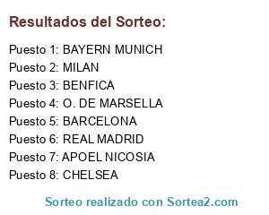Lista de participantes: APOEL NICOSIA, BARCELONA, BAYERN MUNICH, BENFICA, CHELSEA, MILAN, O. DE MARSELLA, REAL MADRID.