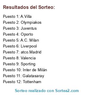 Lista de participantes: atco.Madrid, Oporto, Valencia, Olympiakos, Sporting, Galatasaray, Inter de Milán, Juventus, Liverpool, A.C. Milan, Tottenham, A.Villa.