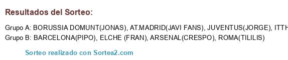 Lista de participantes: AT.MADRID(JAVI FANS), ITTHAD(CARITA), JUVENTUS(JORGE), BORUSSIA DOMUNT(JONAS), ARSENAL(CRESPO), BARCELONA(PIPO), ELCHE (FRAN), ROMA(TILILIS).