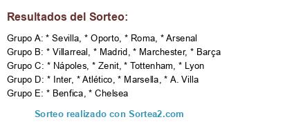 Lista de participantes: * Barça, * Marchester, * Benfica, * Tottenham, * Oporto, * Lyon, * Madrid, * Chelsea, * Atlético, * Marsella, * Zenit, * Roma, * Arsenal, * Inter, * A. Villa, * Sevilla, * Villarreal, * Nápoles.