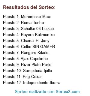 Lista de participantes: Ajax-Capelinho, Independiente-Iborra, Roma-Tonho, Sampdoria-Ipillo, Psg-Cexar, Bayern-Kalimontxo, Rangers-Kikote, Moreirense-Maxi, Schalke 04-Luizao, Chainal H.-Jony, Celtic-SIN GAMER, River Plate-Porto.