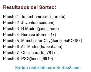Lista de participantes: Milan (Billy_Cooper_88), Arsenal (juanicoo5), Manchester United (ByDanii-), Napoles (cachulymimi), Bayern Munich (ivo_117), Liverpool (evanya), Valencia (xXanjoy70Xx), FC Barcelona (misterpdc).