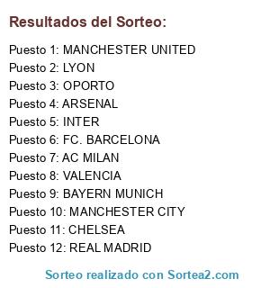 Lista de participantes: VALENCIA, MANCHESTER UNITED, REAL MADRID, OPORTO, BAYERN MUNICH, FC. BARCELONA, CHELSEA, INTER, AC MILAN, LYON, MANCHESTER CITY, ARSENAL.