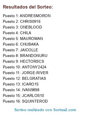 Lista de participantes: JORGE-RIVER, SQUINTEROD, HECTORSCS, ANTONY2424, BELGRATIAS, JCARLOS10, CHILA, ICARO15, ONEBLOOD, CHRIS0916, BRANDONURU, JAICOLLE, ANDRESMORON, IVAN9898, MAUROMAN, CHUBAKA.