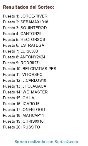 Lista de participantes: VITORSFC, ANDRESMORON, LUIS0303, BELGRATIAS PES, GOTENKS, FITOFARAIS, ANTONY2424, CHILA, ONEBLOOD, SEBAMAX1918, SQUINTEROD, JANO SANTIAGO, ESTRATEGA, CHRIS0916, WE_MASTER, BRANDONURU, CANTOR29, JORGE-RIVER, RODRII271, JHOJAGACA, IVANCASA9898, MAUROMAN, RUSSITO, JAICOLLE, ICARO15, ENSUK, CHUBAKA, HECTORSCS, MATICAP11, CRISLDU14, JUANMATEAM, J.CARLOS10.