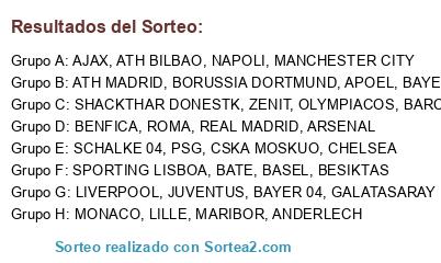 Lista de participantes: NAPOLI, MANCHESTER CITY, ATH MADRID, ZENIT, ARSENAL, BAYER MUNCHEN, REAL MADRID, BARCELONA, BATE, ROMA, CHELSEA, BAYER 04, OLYMPIACOS, SPORTING LISBOA, MONACO, BESIKTAS, BASEL, BENFICA, LIVERPOOL, GALATASARAY, PSG, ANDERLECH, LILLE, JUVENTUS, ATH BILBAO, SHACKTHAR DONESTK, SCHALKE 04, BORUSSIA DORTMUND, MARIBOR, AJAX, APOEL, CSKA MOSKUO.