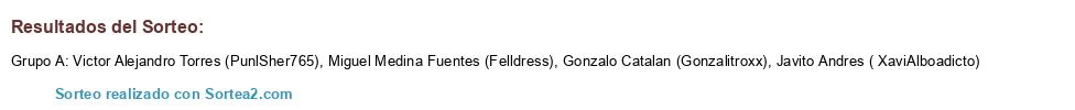 Lista de participantes: Gonzalo Catalan (Gonzalitroxx), Javito Andres ( XaviAlboadicto), Miguel Medina Fuentes (Felldress), Victor Alejandro Torres (PunlSher765).