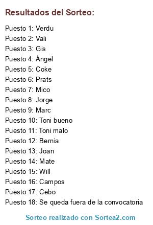 Lista de participantes: Toni bueno, Toni malo, Mico, Coke, Jorge, Marc, Gis, Joan, Cebo, Will, Mate, Prats, Ángel, Bernia, Verdu, Campos, Vali, Se queda fuera de la convocatoria.