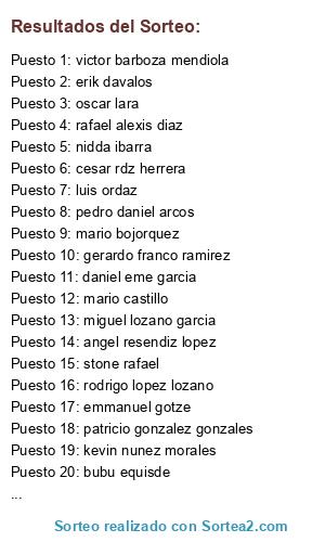 Lista de participantes: miguel flores, zeref, mario bojorquez, pedro daniel arcos, victor barboza mendiola, ian issac ramirez, nidda ibarra, cesar rdz herrera, emmanuel gotze, johan andre rodriguez, bubu equisde, oscar lara, miguel lozano garcia, patricio gonzalez gonzales, rodrigo lopez lozano, daniel eme garcia, saul gonzales corona, andrew murga campos, carlos eduardo giadans, joel atayde, gerardo silva, angel resendiz lopez, toño arandia, erik davalos, stone rafael, kevin nunez morales, luis ordaz, juan manuel calderon gacia, rafael alexis diaz, mario castillo, ivan hernandez, gerardo franco ramirez.