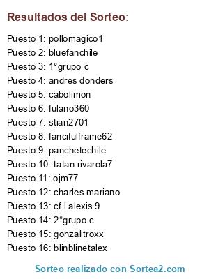 Lista de participantes: panchetechile, charles mariano, cf l alexis 9, stian2701, 1°grupo c, 2°grupo c, pollomagico1, cabolimon, tatan rivarola7, andres donders, fulano360, ojm77, bluefanchile, fancifulframe62, blinblinetalex, gonzalitroxx.