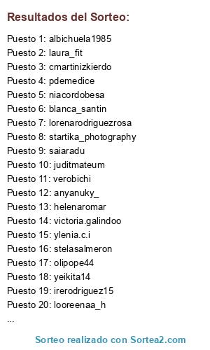 Lista de participantes: irerodriguez15, pyscys80, ylenia.c.i, veronicarenas0106, mabel543, lorenarodriguezrosa (2 participaciones), helenaromar, victoria.galindoo (3 participaciones), looreenaa_h, verobichi, blanca_santin (2 participaciones), conchisiro, saiaradu, maartard, helenaapereea, juditmateum, sandraq88, vallefdez, mariapilar.lopezgar.3, albitafeer, silviarizah, romy.kurt, rafi_montavez, albichuela1985(11 participaciones), xonia.diego6, olipope44, teresitaba, lasagujasdelidia, stelasalmeron, andreafalco_94, laura_fit, gus_pm9, lavaanee_02, arii_arencibia, lidiarq8, yeikita14, conchiglesiass, niacordobesa, pdemedice, patricianoto, maribel_ruizcatala, lojimo, marylucena94, startika_photography (2 participaciones), mrodcan_, yohannagarcia96, yaniregarcia_, anyanuky_, fannyesperon, instadoll22 (2 participaciones), loli_vela, maariacheca16, oletuestilo, cmartinizkierdo.