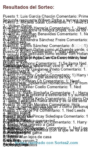 - Ganador 18: Erick Pincay Soledispa Comentario: 1. Ned Leeds 2. Willem Dafoe 3. 7 Civil War Homecoming Infinity War Endgame Far from home Venom 2 No Way Home