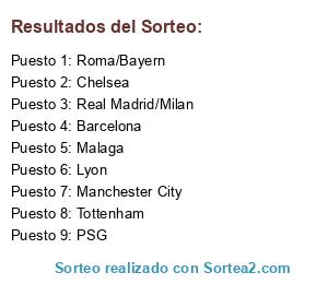 Lista de participantes: Tottenham, Lyon, Malaga, Barcelona, PSG, Real Madrid/Milan, Manchester City, Chelsea, Roma/Bayern.