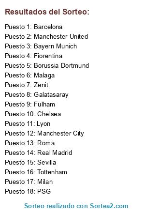Lista de participantes: PSG, Real Madrid, Borussia Dortmund, Barcelona, Tottenham, Manchester City, Milan, Chelsea, Manchester United, Bayern Munich, Malaga, Zenit, Roma, Lyon, Fiorentina, Sevilla, Galatasaray, Fulham.