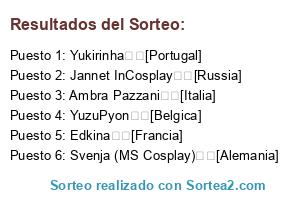 Lista de participantes: Svenja (MS Cosplay) [Alemania], YuzuPyon [Belgica], Edkina [Francia], Ambra Pazzani [Italia], Yukirinha [Portugal], Jannet InCosplay [Russia].