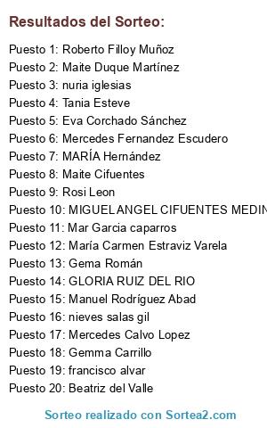 Lista de participantes: Abdelghani Harrati, Abraham Veciana Gutierrez, Abraham Gutierrez, Adan Reina Jurado, Adela Porres Gonçalves, adeli barrera perez, Adolfo Poveda, Adoración Villalba, Adrian Horga, adrian lorca puig, Adriana Cuervo Pignataro, Africa Seron Velasco, Agata Torrella Montserrat, Agatha Martin Rico, Agueda Bartolomé Hernando, agustina Cañamero Ontoria, Ahigor López Marcos, Ainara Blasco, Ainhoa Martínez Hernando, Ainhoa Aguiar Martín, Ainhoa Morata lobato, Ainoa Serrano, Aitana Zubeldia Díaz, Alba Oria obregon, Alba Parada Barrientos, Alba Martinez Alfaro, Alba Enriquez Fernandez, Alba Ortega Garcia, Alba Sastre muñoz, Alba Alconchel, ALBA PINO BONJOCH, Alba Martinez, Alba San Román, Alberto Gimeno Ferrer, Alberto Guerrero Fernández, Alberto Vidal Troitiño, ALBERTO MARTIN DAPIA, alberto alcalde benito, Alejandra Rosero Ortega, Alejandra Soto Llera, Alex Valles Saco, Alex Garrido Martinez, Alex Ibañez, Alexandra Rico, Alexandre Cadoux, Alexia Rodriguez Cabezas, Alexis Romero Lozano, Alfonso Nuño, Alfredo Heredia, Alfredo Reina Moreno, Alfredo Beaumont Saez, Alicia Perez Uris, Alicia Barrancos Cervera, Alicia Álvarez, Alicia Gomez Sanchez, Alicia Olivares, Alicia Asencio Castro, Alicia López Jodar, alicia vives gaton, Alicia Castaños Perez, Allende Rodríguez Rubio, Almudena Gil, Almudena Martín Corchero, almudena moreno lopez, Álvaro Morales, Amanda Pendas fuentes, AMAYA QUIJANO VILLAIZAN, Amaya Sacristan Perez, AMAYA CEINOS, Amparo Calatayud Murillo, Amparo Abad Marco, Amparo Luján sancho, Amparo López Gómez, Amparo Sánchez, Amparo Cobo, Amparo Martí Pueyo, Amparo Bustamante Navarro, Ana Wizner Caballero, Ana Redondo gomez, Ana Martínez, Ana Ferri Frigola, Ana Gimeno, Ana Silva Sousa, ana perez ferrero, Ana Guijarro, Ana Mascarell Olaso, Ana Rojo, Ana Rico Moncho, Ana alvarez, Ana Cuartero, Ana Salces mansilla, Ana Riquelme Sánchez, ANA CORUJO CONCEPCION, Ana Martín Bernal, ana moreno de Matias, Ana Hernando, Ana Fuentes, ANA ORTIZ, Ana Belen Martín, ana belen vilaboa mourenza, Ana Belén Checa Barambio, Ana Belén Chamizo Jurado, Ana Belén Fernández Díaz, Ana del carmen Caballero sarmiento, Ana Isabel Rodriguez Sanchez, Ana Isabel Martínez Hernández, Ana Isabel Porro Castro, Ana M Fernández, Ana Maria Lucaci, Ana Maria fernandez, Ana Maria Castillo Pedrosa, Ana Maria De Fuentes Leco, Ana maria granado, Ana María García Rodriguez, Ana María Vizoso Rodríguez, Ana María Ramos Rodriguez, Ana mary Alba silva, Ana Mercedes Benito, Ana milena Alonso, Ana Silvia Chira, ANABEL OCON RUIZ, Anabel López, ANABELA RUIZ, Anabelle PEREZ GOMEZ, ANAMAR GIL GO, ANARAIDA GONZALEZ ALVAREZ, Andrea Esteban doradi, Andrea Carreño Amezcua, Andrea Vallejo Marchamalo, Andrea Saenz Oriol, Andrea Orozco Villodres, andres perez perez, Andrés Ortega Martínez, Angel Torres Redondo, Angel Moreno Garcia, Angel Chamizo Moreno, Angel Prieto Gil, ANGEL JOSE RODRIGUEZ JUAREZ, Angela Chamizo Castilla, Angela Garijo de Miguel, Angela Molina Ruiz, Angela Fernández moreno, Angela Casanovas Rocafort, Angela Luque Campillo, Ángela Crespo Gonzalo, Angeles Egea Oberé, Angeles Diaz Baena, Angélica Blanco Talaván, Angelines Sánchez Aguado, Angels Sola pujol, Anna Salguero Álvarez, Anna Mir de Gea, Anna Angelova, Anna Scotto di Carlo, Anna Dorca, Anna Galera, Anna Laura Huguet garcia, Antía González Pombo, Antonia Cercas, Antonia Rivas Zuñiga, Antonia López Santiago, Antonia Cuevas alvarez, antonia cabanillas, AnTonia Nieto jurdao, Antonio Pereira Gonzalez, Antonio roldan, Antonio Gayubo Nebreda, ANTONIO GALVEZ GONZALEZ, Antonio Molina, Antonio Aroca, Antonio Hernandez Peña, antonio herrero, Antonio Ruíz Heredia, Antonio Martínez Vernia, Antonio Holguera Bravo, Antonio Sabate, ANTONIO MARTINEZ LEAL, ANTONIO GALAN ROMAN, Antonio Rubiales Sierra, Araceli Galisteo, Araceli Rodriguez González, Arancha Hdez, Argiñe Lekue Agirre, Ariadna N, ARIADNA RIBES, Ariane Montes Fernández, Armando Salas, Armando Ricardo Lucas dos Santos Conde, arturo perez, Ascension Zumeta, Asun SAINZ Camarero, Asun Ayala, Asun Hernández León, Asun Gómez, Asunción Martin Duarte, Aurelio Valero Vallejo, Aurora Castro Luaces, Aurora gutierrez, Aurora Guerra Ordoñez, Aurora Aida Goas Castro, auxi moya, Auxi Navarro Escolano, AUXILIADORA Morenoel Amo, Azucena Isidro del Collado, Barbara Espejo ruiz, Barbara Jodar, Bárbara García Tolosa, Bárbara Palomar Gil, Beatriz Marcos, Beatriz Bodas Arriero, Beatriz Esteban, Beatriz Estefanía, Beatriz De la iglesia rodriguez, Beatriz Sanz Roman, Beatriz Muela Sisamón, Beatriz Álvarez Martín, Beatriz Maldonado Martin, Beatriz Sáez Bernabeu, Beatriz Guillén Aznar, Beatriz del Valle, beatriz llata alvarez, Beatriz Silva González, Beatriz Gárriz Soba, Beatriz Sánchez, Beatriz Calero Gómez, Beatriz Garcia Cendan, Begoña Jones, begoña diaz ramirez, Begoña Lagardera, Begoña Collazo Ortega, Begoña belmonte, Begoña Montero Blanco, BELEN Palomero, BELEN SERRANO, Belen Rodríguez, Belen Arribas de Antonio, BELEN MARTINEZ GOMEZ, Belén Miranda, Belén Díaz Bardillo, Belén Alonso sainz, Belén Serrano Penabades, Belén Sabina Perez, Benito Del amo martinez, Benji Saldaña Gutiérrez, Beny Garcia Santos, Bernardo Calatayud Iborra, Berta Gutiérrez De Cos, Bertha García-Valdecasas, Blanca Auñon Garcia, Blanca Rodríguez Ruiz, Blanca Esteban, Bogdan Panga, Camelia Sánchez Plaza, camila lopez, Carla Carranza parra, CARLES JOVER, Carlos Planelles Ordóñez, Carlos Polo García, Carlos Vila Montolio, Carlos Cortés González, Carlos Palma, Carlos Casarramona Sánchez, Carlos Chavero de Pablo, Carlos Blasco Alfonso, Carlos Gustavo Parrilla Parrilla Ibañez, Carme Guiu Díaz, Carmen Carcaño Pareja, Carmen Jiménez llorente, Carmen Rámila Valladolid, Carmen Fdz garcia, Carmen Hervas Zarco, Carmen Palma, Carmen Sanchez Trigueros, Carmen Torrico ruiz, Carmen Cabanas, Carmen Perez Gonzalez, CARMEN NUÑEZ OCON, CARMEN LÓPEZ GARCÍA, Carmen del Castillo
