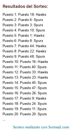 Lista de participantes: Puesto 1: Hawks, Puesto 2: Spurs, Puesto 3: Spurs, Puesto 4: Hawks, Puesto 5: Spurs, Puesto 6: Spurs, Puesto 7: Spurs, Puesto 8: Spurs, Puesto 9: Hawks, Puesto 10: Spurs, Puesto 11: Spurs, Puesto 12: Spurs, Puesto 13: Hawks, Puesto 14: Spurs, Puesto 15: Hawks, Puesto 16: Hawks, Puesto 17: Spurs, Puesto 18: Hawks, Puesto 19: Spurs, Puesto 20: Spurs, Puesto 21: Spurs, Puesto 22: Hawks, Puesto 23: Hawks, Puesto 24: Spurs, Puesto 25: Spurs, Puesto 26: Spurs, Puesto 27: Hawks, Puesto 28: Hawks, Puesto 29: Spurs, Puesto 30: Spurs, Puesto 31: Spurs, Puesto 32: Spurs, Puesto 33: Hawks, Puesto 34: Spurs, Puesto 35: Spurs, Puesto 36: Spurs, Puesto 37: Spurs, Puesto 38: Spurs, Puesto 39: Spurs, Puesto 40: Spurs, Puesto 41: Spurs, Puesto 42: Hawks, Puesto 43: Spurs, Puesto 44: Hawks, Puesto 45: Spurs, Puesto 46: Spurs, Puesto 47: Spurs, Puesto 48: Spurs, Puesto 49: Spurs, Puesto 50: Hawks.