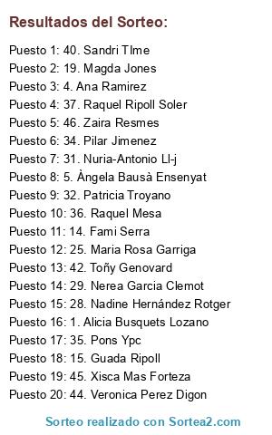 Lista de participantes: 1. Alicia Busquets Lozano, 2. Ami Deni, 3. Ana Diaz, 4. Ana Ramirez, 5. Àngela Bausà Ensenyat, 6. Benito Jimenez Piñero, 7. Carina Silva, 8. Carmen García, 9. Carmen Molto Pomar, 10. Carolina Gómez Villegas, 11. Cati Castells, 12. Conchi Del Moral Lopez, 13. Ely Duque, 14. Fami Serra, 15. Guada Ripoll, 16. Jenni VD, 17. KaRi GM, 18. Lida VH, 19. Magda Jones, 20. Marcelo Villar Gonzalez, 21. Marga Coll Vivas, 22. Maria Asecas, 23. María Belén Ruiz, 24. Maria Mayans, 25. Maria Rosa Garriga, 26. Maria Vinseiro Castaño, 27. Monica Samaniego Garcia, 28. Nadine Hernández Rotger, 29. Nerea Garcia Clemot, 30. Núria LLiteras Tesouro, 31. Nuria-Antonio Ll-j, 32. Patricia Troyano, 33. Patty Ordoñez de Jaramillo, 34. Pilar Jimenez, 35. Pons Ypc, 36. Raquel Mesa, 37. Raquel Ripoll Soler, 38. Rosalia Barros, 39. Sandra Rodriguez, 40. Sandri TIme, 41. Sebastian Paso, 42. Toñy Genovard, 43. Uxia Alonso Casabona, 44. Veronica Perez Digon, 45. Xisca Mas Forteza, 46. Zaira Resmes.