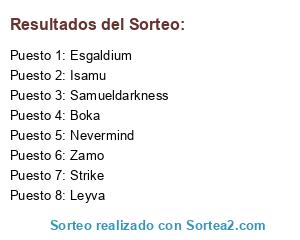 Lista de participantes: Zamo, Isamu, Esgaldium, Leyva, Boka, Samueldarkness, Nevermind, Strike.