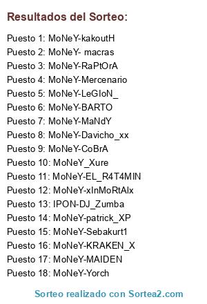 Lista de participantes: MoNeY-EL_R4T4MIN, MoNeY_Xure, MoNeY-RaPtOrA, IPON-DJ_Zumba, MoNeY-LeGIoN_, MoNeY- macras, MoNeY-patrick_XP, MoNeY-xInMoRtAlx, MoNeY-KRAKEN_X, MoNeY-CoBrA, MoNeY-MAIDEN, MoNeY-BARTO, MoNeY-Mercenario, MoNeY-Sebakurt1, MoNeY-Yorch, MoNeY-Davicho_xx, MoNeY-kakoutH, MoNeY-MaNdY.