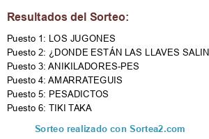 Lista de participantes: LOS JUGONES, TIKI TAKA, ANIKILADORES-PES, ¿DONDE ESTÁN LAS LLAVES SALINAS?, PESADICTOS, AMARRATEGUIS.