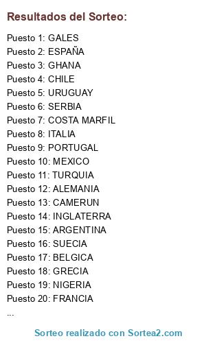 Lista de participantes: ALEMANIA, ARGENTINA, BELGICA, BRASIL, CAMERUN, CHILE, COLOMBIA, COSTA MARFIL, CROACIA, GHANA, ESPAÑA, FRANCIA, GRECIA, HOLANDA, INGLATERRA, NIGERIA, ITALIA, MEXICO, PORTUGAL, GALES, SERBIA, SUECIA, TURQUIA, URUGUAY.