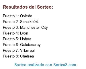 Lista de participantes: Norwich, Villarreal, Lisboa, Leicester, Galatasaray, Oviedo, Stoke City, Napoles, Atletico, Chelsea, Lyon, Manchester City, Schalke04, Zenit, Leverkusen, Lazio.