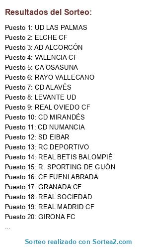 Lista de participantes: CD ALAVÉS, ATHLETIC CLUB, C. ATLÉTICO DE MADRID, FC BARCELONA, REAL BETIS BALOMPIÉ, RC CELTA DE VIGO, SD EIBAR, RCD ESPANYOL, GETAFE CF, GRANADA CF, CD LEGANÉS, LEVANTE UD, RCD MALLORCA, CA OSASUNA, REAL MADRID CF, REAL SOCIEDAD, SEVILLA FC, VALENCIA CF, REAL VALLADOLID, VILLARREAL CF, ALBACETE BALOMPIÉ, AD ALCORCÓN, ALMERÍA CF, CÁDIZ CF, RC DEPORTIVO, ELCHE CF, EXTREMADURA UD, CF FUENLABRADA, GIRONA FC, SD HUESCA, UD LAS PALMAS, CD LUGO, MÁLAGA CF, CD MIRANDÉS, CD NUMANCIA, REAL OVIEDO CF, SD PONFERRADINA, R. RACING CLUB, RAYO VALLECANO, R. SPORTING DE GIJÓN, CD TENERIFE, REAL ZARAGOZA.