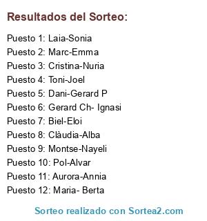 Lista de participantes: Dani-Gerard P, Clàudia-Alba, Toni-Joel, Gerard Ch- Ignasi, Aurora-Annia, Montse-Nayeli, Cristina-Nuria, Maria- Berta, Biel-Eloi, Laia-Sonia, Marc-Emma, Pol-Alvar.