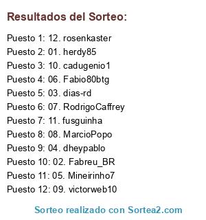 Lista de participantes: 01. herdy85, 02. Fabreu_BR, 03. dias-rd, 04. dheypablo, 05. Mineirinho7, 06. Fabio80btg, 07. RodrigoCaffrey, 08. MarcioPopo, 09. victorweb10, 10. cadugenio1, 11. fusguinha, 12. rosenkaster.