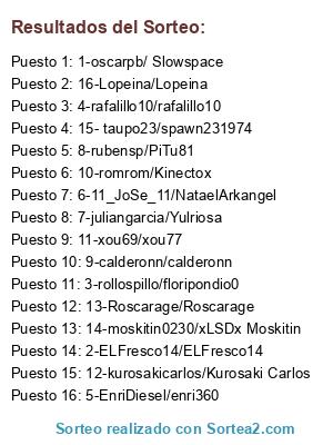 Lista de participantes: 1-oscarpb/ Slowspace, 2-ELFresco14/ELFresco14, 3-rollospillo/floripondio0, 4-rafalillo10/rafalillo10, 5-EnriDiesel/enri360, 6-11_JoSe_11/NataelArkangel, 7-juliangarcia/Yulriosa, 8-rubensp/PiTu81, 9-calderonn/calderonn, 10-romrom/Kinectox, 11-xou69/xou77, 12-kurosakicarlos/Kurosaki Carlos, 13-Roscarage/Roscarage, 14-moskitin0230/xLSDx Moskitin, 15- taupo23/spawn231974, 16-Lopeina/Lopeina.