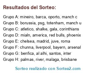 Lista de participantes: arsenal, bayern, atletico, oporto, inter, totenham, mialn, roma, palmas, barca, juve, shalke, psg, manch c, manch u, benfica, madrid, borussia, malaga, chelsea, liverpool, gala, red bulls, america, santos, corinthians, mineiro, river, phoenix, brisbane, chunna, al alhi.