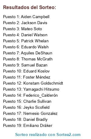 Lista de participantes: Yamagachi Hitsumo, Daniel Watson, Eduard Koslov, Thomas McGrath, Mateo Soto, Patrick Whelan, Federico Calderón, Daniel Bradly, Konstam Goldschmidt, Nemesio Gonzalez, Jeyko Scofield, Aiden Campbell, Emiliano Dráker, Foster Méndez, Samuel Bazan, Eduardo Walsh, Aquiles DeShaun, Charlie Sullivan, Jackson Davis.