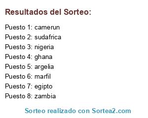 Lista de participantes: zambia, sudafrica, nigeria, ghana, egipto, marfil, camerun, argelia.