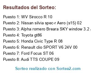 Lista de participantes: Toyota gt86, Audi TTS COUPE 09, Ford Focus ST 06, WV Sirocco R 10, Honda Civic Type R 08, Renault clio SPORT V6 24V 00, Alpha romero Breara SKY window 3.2 JYSQ4 06, Nissan silvia spec-r Aero (s15) 02.
