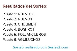 Lista de participantes: BOSFROT, FOLLANCUEROS, AGUILUCHOS, CHULIMEN, NUEVO1, NUEVO 2.