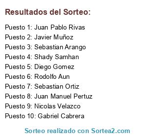 Lista de participantes: Javier Muñoz, Sebastian Arango, Juan Manuel Pertuz, Nicolas Velazco, Juan Pablo Rivas, Sebastian Ortiz, Rodolfo Aun, Diego Gomez, Shady Samhan, Gabriel Cabrera.