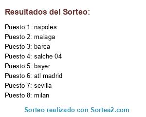 Lista de participantes: atl madrid, barca, sevilla, napoles, milan, malaga, bayer, salche 04.