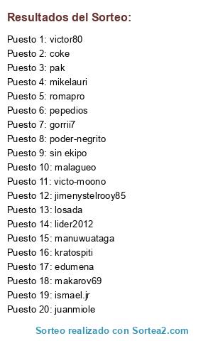 Lista de participantes: edumena, romapro, coke, poder-negrito, pak, mikelauri, ismael.jr, pepedios, lider2012, victor80, losada, juanmiole, malagueo, kratospiti, makarov69, gorrii7, manuwuataga, victo-moono, jimenystelrooy85, sin ekipo.