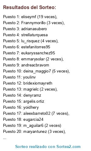 Lista de participantes: anagrabeel (4 veces), katiuskabadillo (3 veces), nalyaanmora (5 veces), Fabianamql (6 veces),, vaneoberto (6 veces),, laurav_space (2 veces),, tefyobl (29 veces),, genesiskb (8 veces),, endrina.correa (5 veces),, michii2809 (2 veces),, omargelysvcm (2 veces),, karlayub_20 (5 veces),, briggithwu18 (4 veces),, salessaandra (2 veces),, jessenianpi (4 veces),, Frannymorillo (3 veces),, lilaloopez (3 veces),, heileencabb (4 veces),, tita_ama (2 veces),, aleexbarreto02 (7 veces),, skghb_sindy (3 veces),, yanethespana80 (3 veces),, lisbeidyzerpa (3 veces),, danibethamzer (4 veces),, mcjm_24 (4 veces),, marielvisreyes (13 veces),, niraili_arantza (3 veces),, lucianamassimo (3 veces),, leidy271089 (7 veces),, rosacolmenarez (6 veces),, fabicon_t (7 veces),, loany06 (2 veces),, lu_risquez (4 veces),, argiolysortiz (4 veces),, deina_maggio7 (5 veces),, stepha.tm (6 veces),, tiffa26 (2 veces),, greicylingarcia (4 veces),, adrianabasanta (4 veces),, maria.dlapr (2 veces),, naylizcarbonell (10 veces),, inawm1 (2 veces),, magrielc (2 veces),, ysabeldvs (3 veces),, yoa07rivas (2 veces),, jacquelinemojica63 (4 veces),, eliseymf (19 veces),, maryantunez (3 veces),, emmarysolar (2 veces),, perozo.mariaa (3 veces),, elizflores01 (22 veces),, vanessacedeno17 (3 veces),, m_aguilar6 (2 veces), denyramz, mariajzo23, youlinv, andreacbravom, maryaguilar_01, orselismedina, mari.oro17, bridexiomayreth, adrianasubero, mariannydivito, yenlimarg, eukaryssanchez95, estefany_voici, estefanitorres95, argelis.ortiz, eugarcia24, gelen_pinto, anitad_16, anto_6297, nathalymoralesrio, gmar_1294, ambar_amaro, yngrid0509, gaviotamarabina, yoidhery, dianora.s, gthayly, strellaturquesa.
