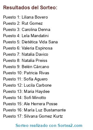 Lista de participantes: Liliana Bovero, Dietética Vida Sana, Belén Cárcano, Sofi Minotto, Silvana Gomez Kurtz, Natalia Davico, Lucila Carbone, Patricia Rivas, Rut Gomez, Carolina Denna, Maria Haydee, María Luz Bustamante, Lela Mandatini, Ale Herrera Posse, Valeria Espinosa, Natalia Preiss, Sofía Aguero.