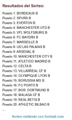 Lista de participantes: AJAX B, ARSENAL B, AS ROMA B, ATHLETIC BILBAO B, ATLETICO MADRID B, BAYER 04 B, BOR. DORTMUND B, BORDEAUX B, BORUSSIA MG B, CELTA B, EVERTON B, FC BAYERN B, FC PORTO B, INTER B, LIVERPOOL B, MALAGA CF B, MANCHESTER CITY B, MANCHESTER UTD B, MARSEILLE B, OLYMPIAKOS B, OLYMPIQUE LYON B, REAL BETIS B, SAMPDORIA B, SPURS B, UD LAS PALMAS B, VFL WOLFSBURG B, VILLARREAL CF B, WERDER BREMEN B.