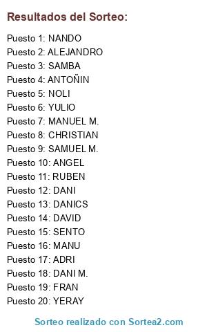 Lista de participantes: MANU, FRAN, SAMBA, DANICS, YERAY, ANGEL, ANTOÑIN, DAVID, ADRI, DANI, SAMUEL M., DANI M., NOLI, ALEJANDRO, MANUEL M., CHRISTIAN, RUBEN, SENTO, YULIO, NANDO.