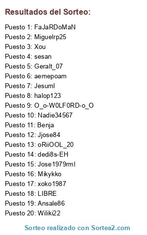 Lista de participantes: Geralt_07, Jose1979rml, oRiiOOL_20, sesan, Jesuml, aemepoam, halop123, Mikykko, Nadie34567, Xou, Wiliki22, xoko1987, Jjose84, O_o-W0LF0RD-o_O, Miguelrp25, Ansale86, dedi8s-EH, FaJaRDoMaN, Benja, LIBRE.